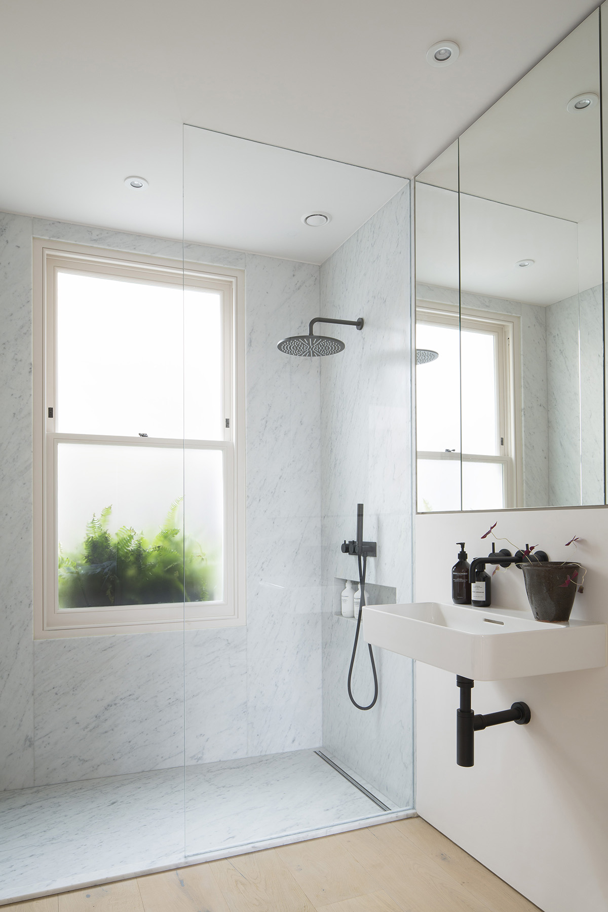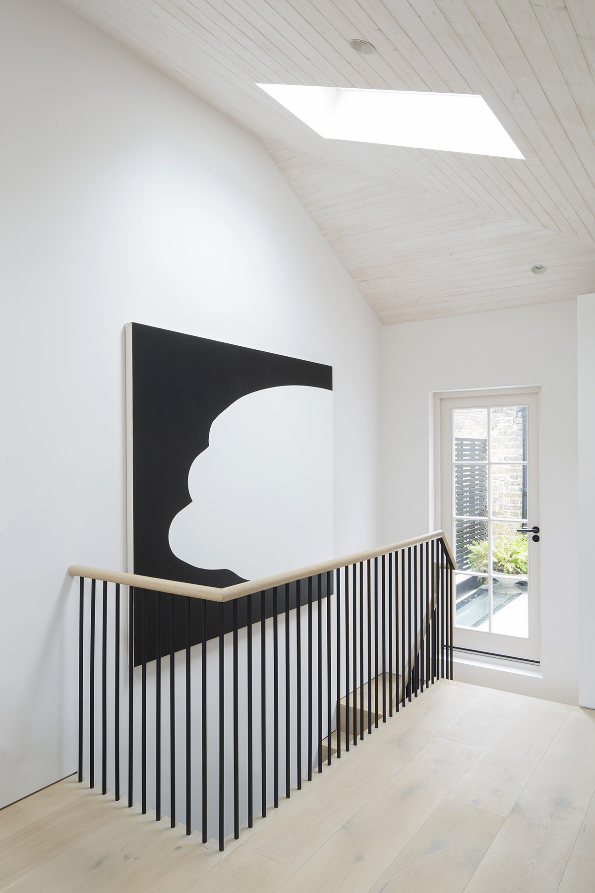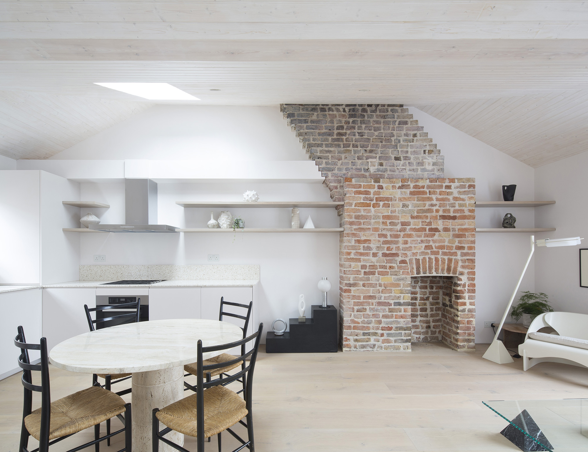 The dual aspect living and kitchen area is flooded with light, from additional rooflights as well as the existing windows apertures, with access out onto the roof terrace. We retained the original fireplace which has been stripped back to preserve an original historic feature at the heart of the home, whilst cladding the ceiling in whitened timber to soften the space. The walls reflect the light creating an ever changing space throughout the day and the seasons. The generous kitchen fits across the rear of the property with minimal fittings, and a complimentary terrazzo worktop.