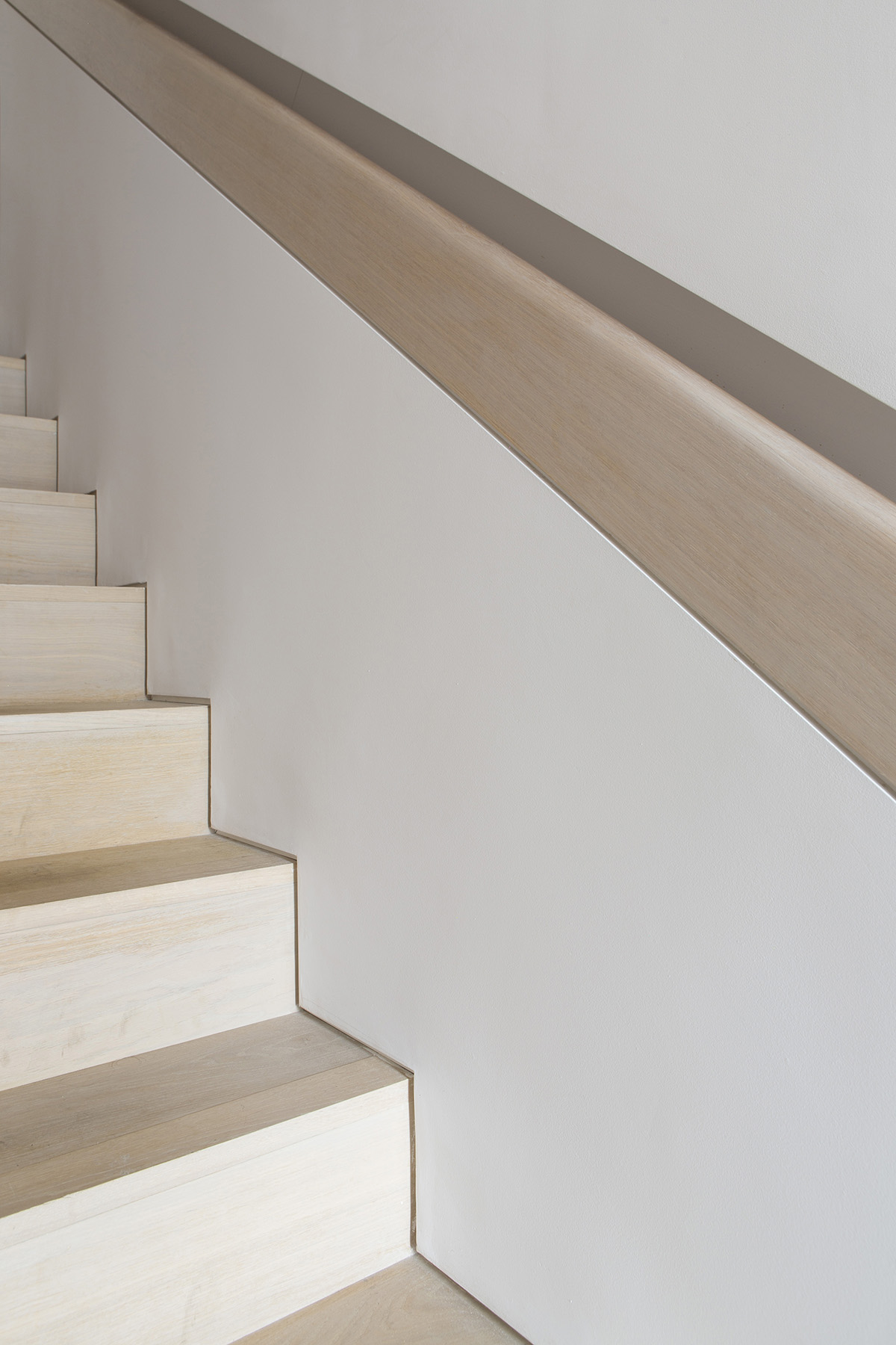 From the entrance hallway we treated the two staircases as separate yet related design elements, with a crisp concealed handrail to first floor, with whitened oak flooring and a feature open stair up to the living area allowing the light to permeate down into the heart of the home. The main bedroom opens onto Portobello road, with a generous sense of space in neutral tones and a master bathroom in honed Carrara marble. The second bedroom is within the extension, benefitting from more natural light through the walk on glazed rooflight and French windows.